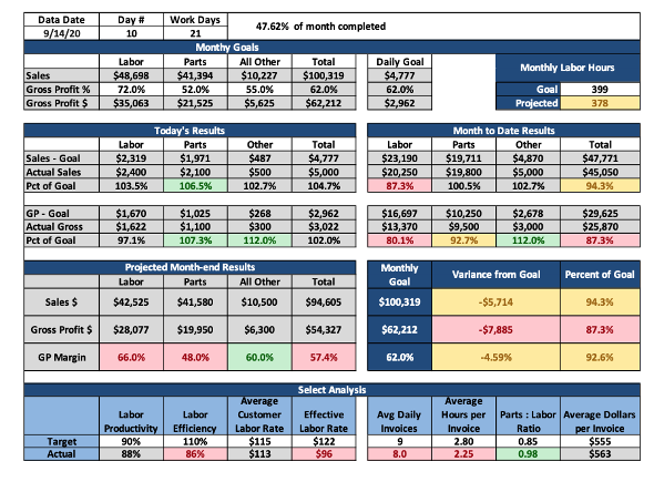 Halfway through the month, this example indicates a modest shortfall from targets. If the percentages were above 100%, then the business would be tracking better than targets. Modern bookkeeping systems allow you to create reports like this with an amazing amount of detail. Even if you do not have a modern system, you can create any report format you want using Microsoft Excel. Provided you have goals, input your financial information daily, have a report template, and use it, you will know the health of your business every day.